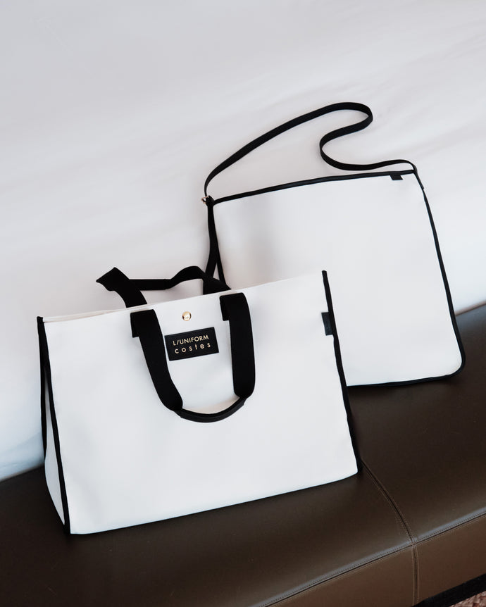 In 2025, the collaboration is enriched with a new canvas combining white with contrasting black, staying true to the DNA of both houses and to L/UNIFORM’s technical fundamentals: a woven, coated, waterproof canvas with an anti-stain treatment. This canvas is available in two models and features a new hot-stamped black leather label: the foldable bag N°151 and the postman N°139.