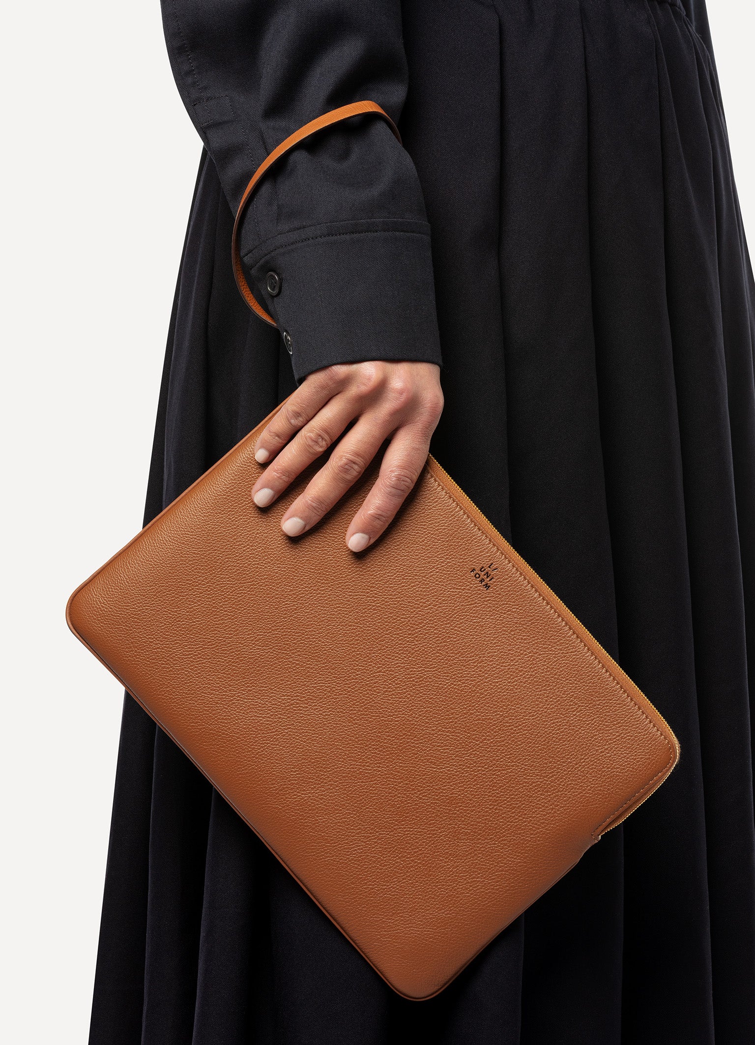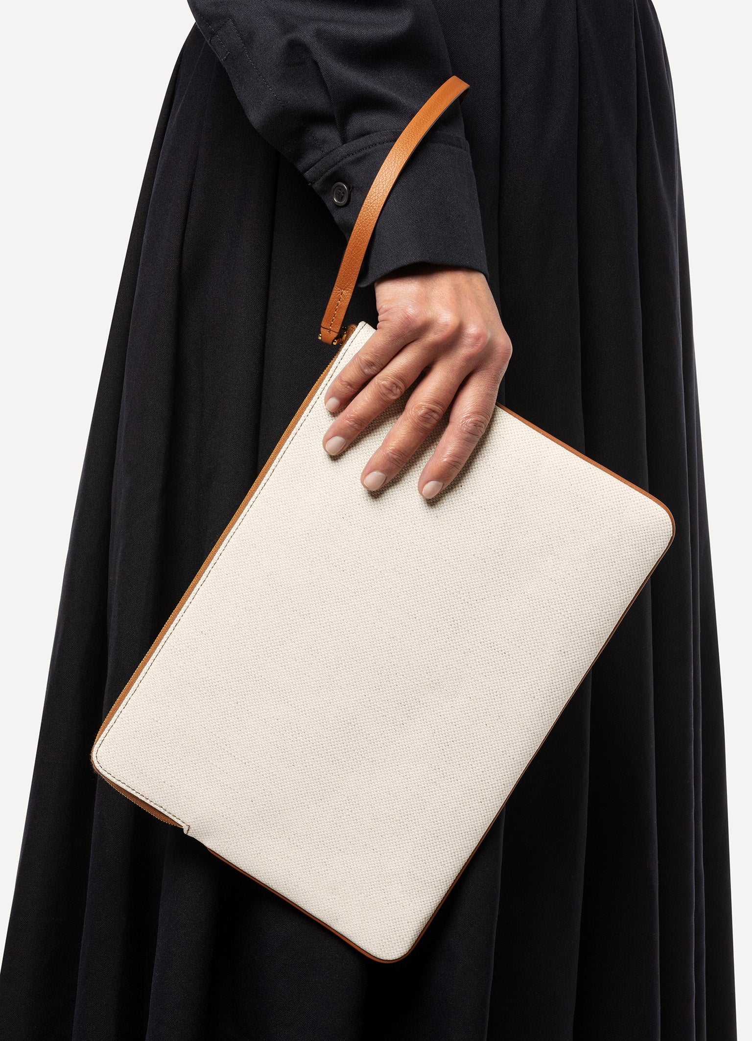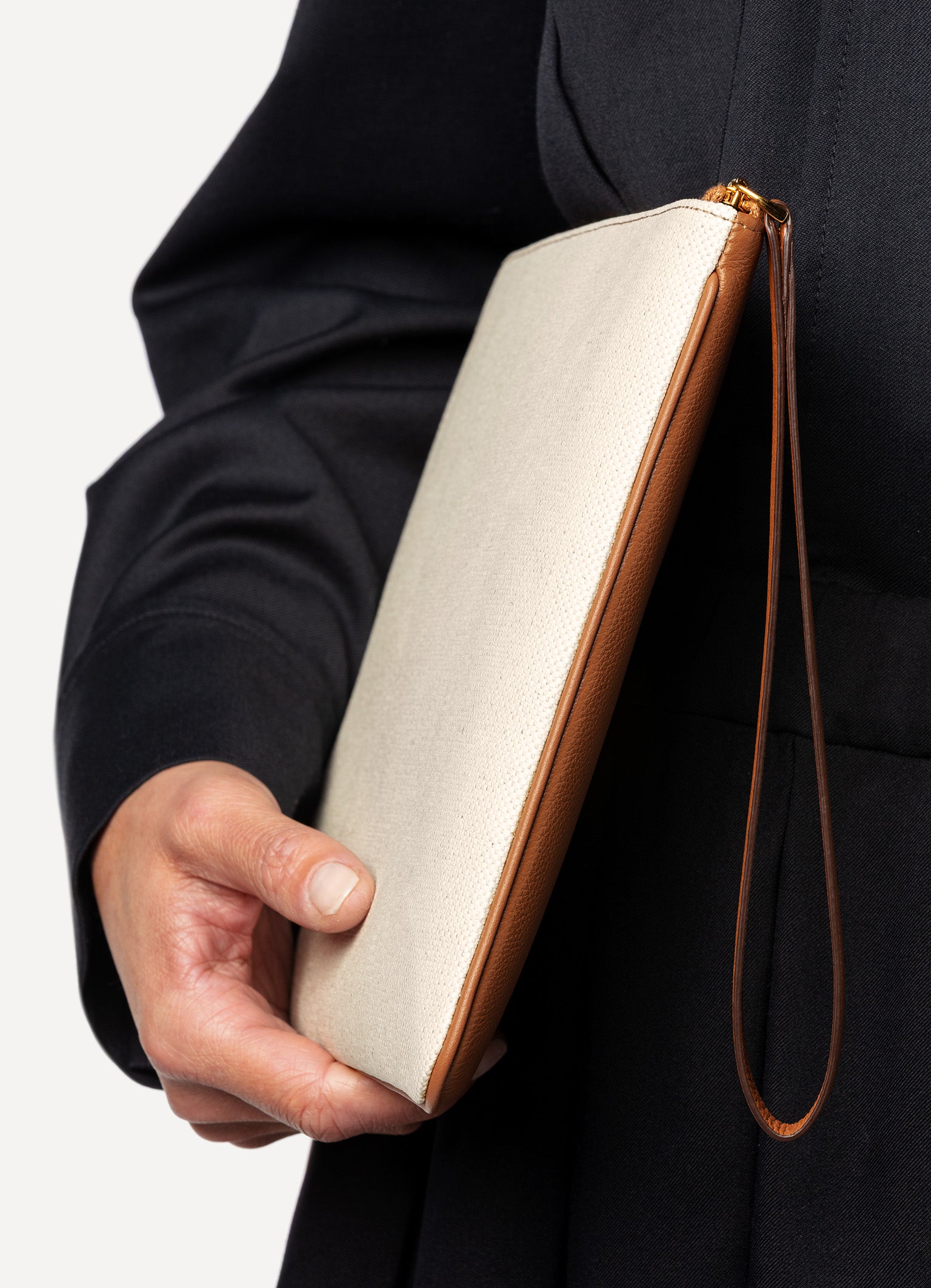 You will take the No. 29 pouch everywhere, in a bag, around your wrist thanks to its wrist strap or under your arm for an elegant and modern look. It opens with a zipper going down the side, allowing for greater ease of use. The leather pouch combines a woven canvas side and a calfskin side. Our calfskin from Spain is full grain, a guarantee of high quality of the material with a regular and smooth grain, which will develop a uniform patina over time. It is dyed in the mass, dry-milled for more flexibility and treated to be protected from water. The interior is exclusively in leather with 6 compartments for all your cards.