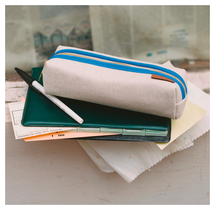 La trousse apparaît dans une vie lors de l’entrée à l’école et n’en ressort pratiquement jamais. Et pour cause : soit elle demeure l’accessoire de l’écolier devenu pilote, docteur ou président(e), soit elle est détournée pour devenir trousse à maquillage ou à tout autres choses car ses vocations sont multiples. La Trousse No. 14 est parallélépipédique, ce qui, concrètement, évite de l’écraser lorsqu’on la range dans un sac ou un cartable. Elle est en toile tissée. Son ouverture zippée, qui court sur toute sa longueur, permet d’y trouver immédiatement ce que l’on cherche. Ce qui est la moindre des choses pour une trousse.