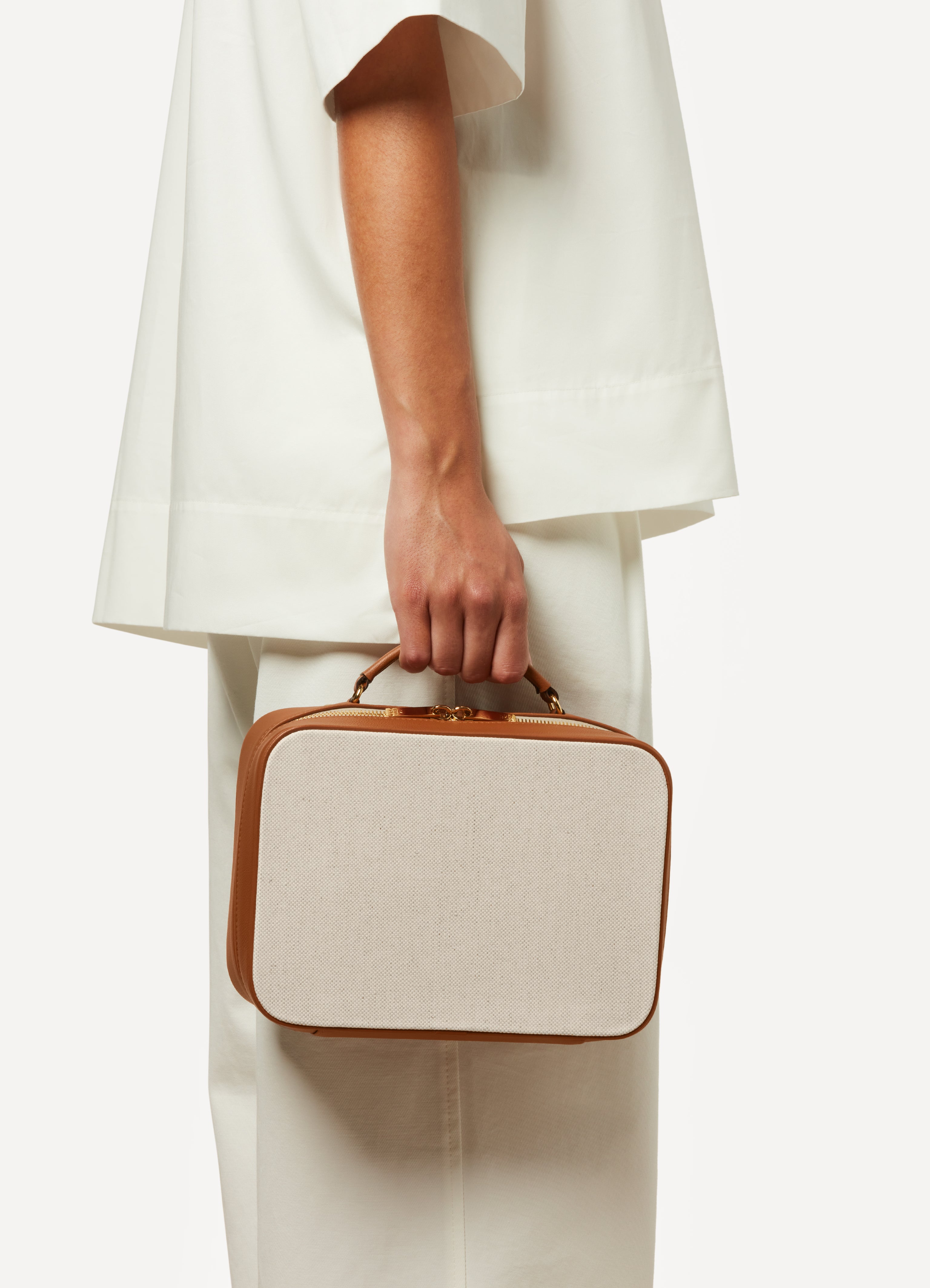 ミニチュアスーツケースNo.85はキャンバスとレザーで作られています。内側にファスナー付きポケットと名刺用スロットが付いており、一日に必要なものをすべて(あるいはそれ以上)収納できます。