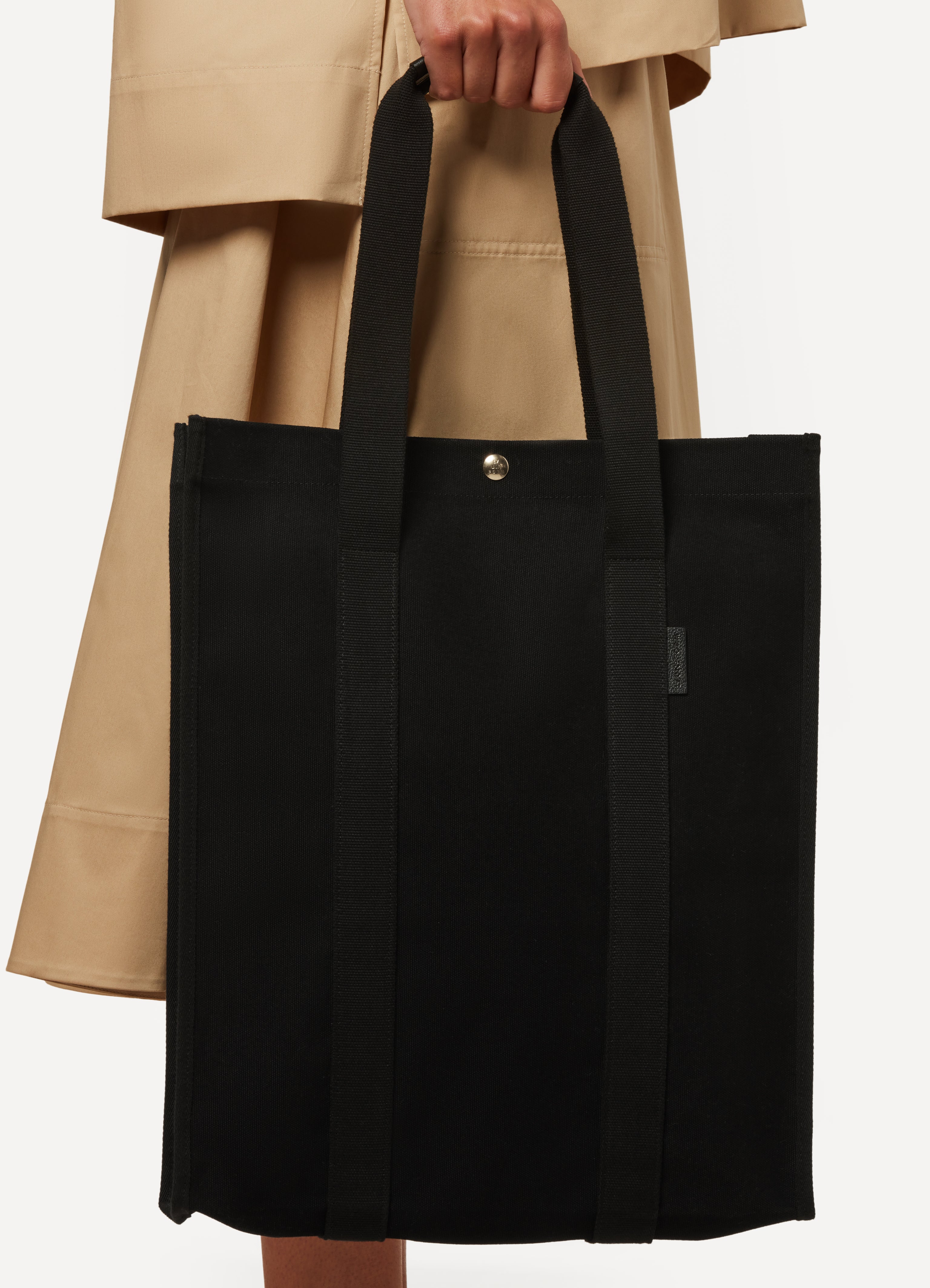 Le Sac de presse No.41 en toile arbore deux sangles cousues sur sa hauteur qui se terminent en poignées. Il possède une petite poche intérieure et se ferme par un bouton pression.