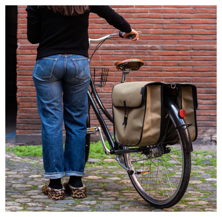 La double sacoche vélo No. 105 est conçue pour transporter vos affaires du quotidien sur le porte-bagages de votre vélo. Les sacoches peuvent être roulées ou déroulées en toute simplicité selon vos besoins grâce aux pattes en cuir ajustables. Elles peuvent accueillir un volume total de 33 Litres soit 16,5 Litres par sacoche.